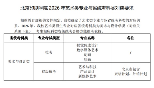 北京印刷學(xué)院2026年藝術(shù)類專業(yè)與省統(tǒng)考科類對(duì)應(yīng)要求