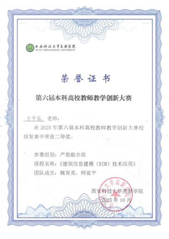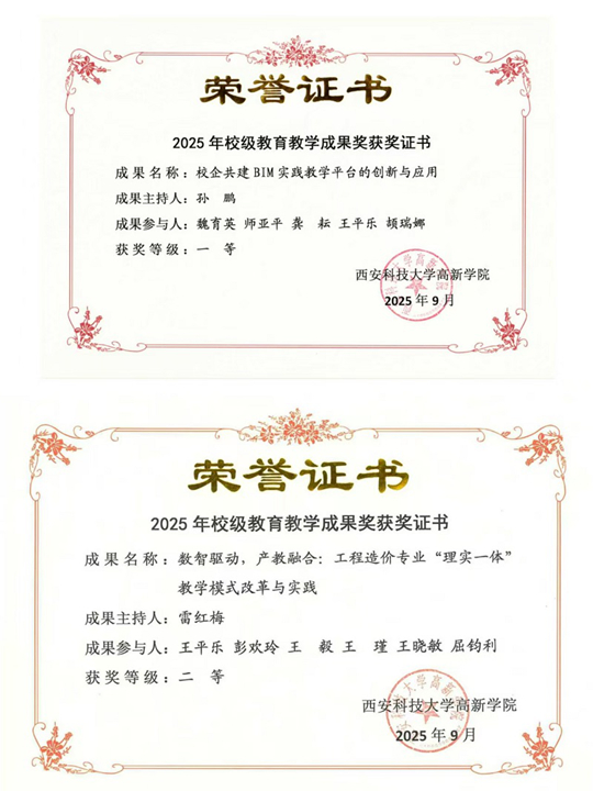 教學(xué)改革持續(xù)深化,創(chuàng)新成果亮點(diǎn)紛呈。在2025年校級(jí)教育教學(xué)成果獎(jiǎng)評(píng)選中,科技與工程學(xué)院牽頭完成的“校企共建BIM實(shí)踐教學(xué)平臺(tái)的創(chuàng)新與應(yīng)用”榮獲一等獎(jiǎng),“數(shù)智驅(qū)動(dòng),產(chǎn)教融合:工程造價(jià)專業(yè)‘理實(shí)一體’教學(xué)模式改革與實(shí)踐”斬獲二等獎(jiǎng),集中體現(xiàn)了學(xué)院在BIM實(shí)踐教學(xué)平臺(tái)構(gòu)建、課程體系優(yōu)化、理實(shí)一體化改革等方面的深入探索與顯著成效。在第六屆本科高校教師教學(xué)創(chuàng)新大賽中,王平樂(lè)老師領(lǐng)銜、魏育英、師亞平參與的《建筑信息建模(BIM)技術(shù)應(yīng)用》課程,憑借鮮明的產(chǎn)教融合特色與創(chuàng)新的教學(xué)方法,榮獲產(chǎn)教融合組二等獎(jiǎng),進(jìn)一步印證了學(xué)院BIM課程建設(shè)的高水平與教學(xué)創(chuàng)新的持續(xù)突破。