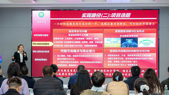 第十九屆“挑戰(zhàn)杯”國賽三等獎指導老師李華君為在場師生帶來一場干貨滿滿的分享。其獲獎項目以“特色產業(yè)融合助推縣域經濟高質量發(fā)展”為主題,聚焦陜南3市11縣茶產區(qū),組建跨工程造價、視覺傳達、網絡與新媒體、計算機等多學科團隊,歷經三年深入調研,從產品、技術、文化、系統(tǒng)四個維度推動茶產業(yè)升級:在產品上融合安康富硒茶與涇陽茯茶工藝,研發(fā)出金花菌更豐富、健康價值更高的富硒茯茶;在技術上設計新型自動控溫控濕發(fā)花裝置,實現(xiàn)降本增效與發(fā)花均勻;在文化上挖掘“貢茶文化”“茶馬古道”內涵,打造特色文創(chuàng)包裝;在系統(tǒng)上運用全生命周期成本管理方法優(yōu)化茶產業(yè)園區(qū)建設,并構建“內容+技術+渠道”立體傳播矩陣擴大品牌影響。該項目不僅為地方茶產業(yè)注入新活力,也構建了一套可復制、可推廣的鄉(xiāng)村振興數(shù)字化解決方案。李華君老師從選題立意、細節(jié)打磨,到跨學科協(xié)作與團隊心態(tài)管理,全面拆解競賽關鍵環(huán)節(jié),傾囊相授實戰(zhàn)經驗,為學生們搭建起從校園學習走向國賽舞臺的堅實橋梁。