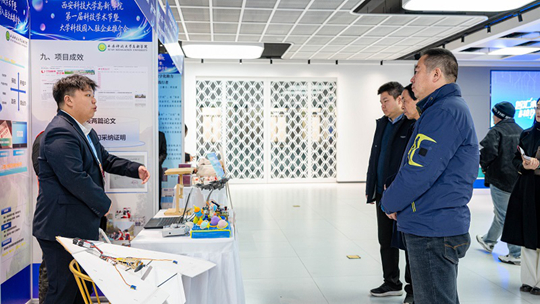 活動最后,學院領導一行走進六個學生科技作品展區(qū),與各項目團隊面對面交流,深入了解學生在人工智能、節(jié)能環(huán)保、文化創(chuàng)意等領域的創(chuàng)新實踐。領導們認真聽取講解,細致詢問作品的設計理念、技術路徑與應用前景,并就項目可行性及后續(xù)發(fā)展提出寶貴建議。學生們扎實的專業(yè)功底、清晰的表達與敢于突破的精神,獲得了充分肯定。