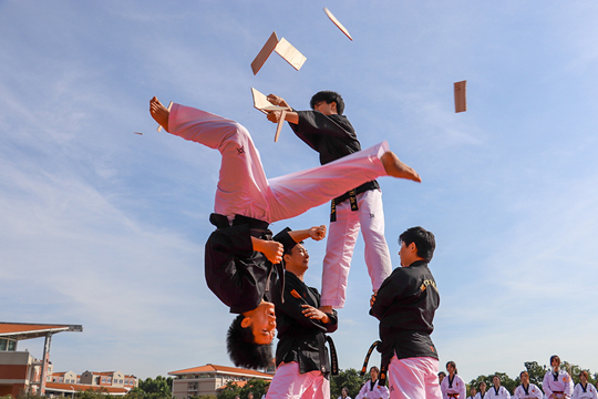 開幕式表演上,武術(shù)、跆拳道、瑜伽等俱樂部的學(xué)生代表帶來以“健康快樂”為主題的跆拳道表演。該表演由跆拳道俱樂部牽頭,融入特技等元素。同學(xué)們通過“方正承韻”“五星同心”“英才領(lǐng)航”“梯次登高”四幕表演,展現(xiàn)了嘉庚學(xué)子昂揚(yáng)的精神風(fēng)貌,為運(yùn)動會拉開精彩序幕。