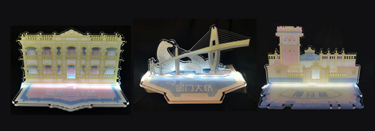 在地域文化主題作品中,僑鄉(xiāng)建筑與閩南煙火氣被巧妙復(fù)刻。金門古厝的燕尾脊、騎樓的雕花廊柱,化作了精致小巧的《金門建筑立牌》,指尖輕觸便能感受僑鄉(xiāng)建筑的獨(dú)特韻味;閩南建筑的紅磚黛瓦、窗欞紋樣,被搬進(jìn)《木質(zhì)紙雕燈設(shè)計(jì)》,開燈瞬間,光影流轉(zhuǎn)間盡是古厝的溫柔與詩(shī)意;《閩南飲食文化文創(chuàng)冰箱貼》則將泉州五店市戲臺(tái)、關(guān)岳廟、西街等特色具象化,貼在冰箱上,仿佛能聞到閩南街頭的濃濃煙火氣。