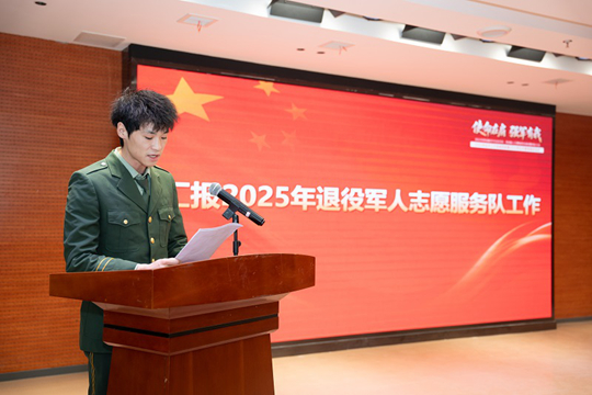 第二屆志愿服務(wù)隊(duì)負(fù)責(zé)人孫澤云發(fā)言,他總結(jié)了2025年退役軍人志愿服務(wù)隊(duì)工作,并梳理了服務(wù)隊(duì)過去一年圍繞核心主題策劃,并成功實(shí)施的多項(xiàng)志愿活動(dòng),如國防教育政策宣講、軍事技能訓(xùn)練、國防知識(shí)宣傳等,并表示今后退役軍人志愿服務(wù)隊(duì)將繼續(xù)努力,為退役大學(xué)生服務(wù)事業(yè)貢獻(xiàn)力量。