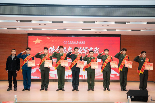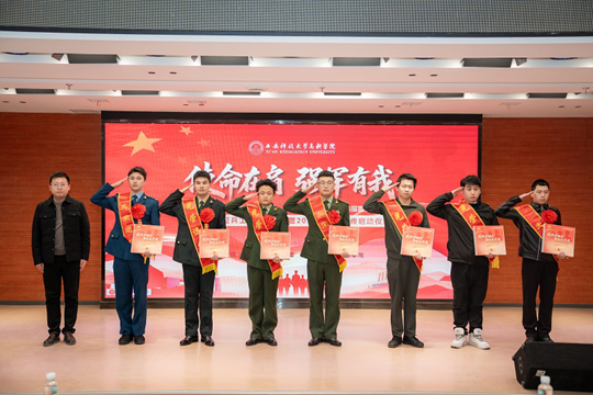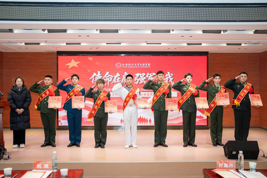 12月10日,西安科技大學(xué)高新學(xué)院2025年退役復(fù)學(xué)學(xué)生歡迎會(huì)、退役軍人志愿服務(wù)隊(duì)換屆暨表彰大會(huì)、2025年征兵工作總結(jié)表彰暨2026年征兵宣傳啟動(dòng)儀式,在學(xué)院圖書館報(bào)告廳隆重舉行。