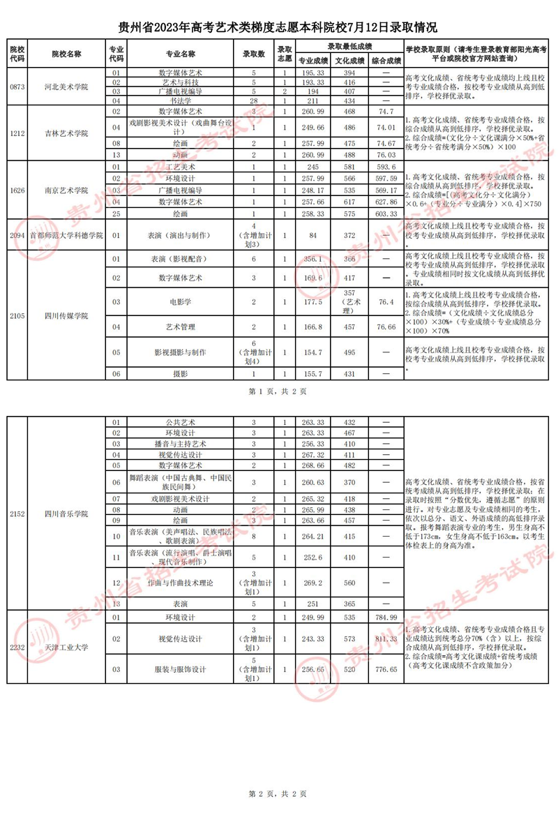 貴州省2023年高考藝術(shù)類梯度志愿本科院校7月12日錄取情況