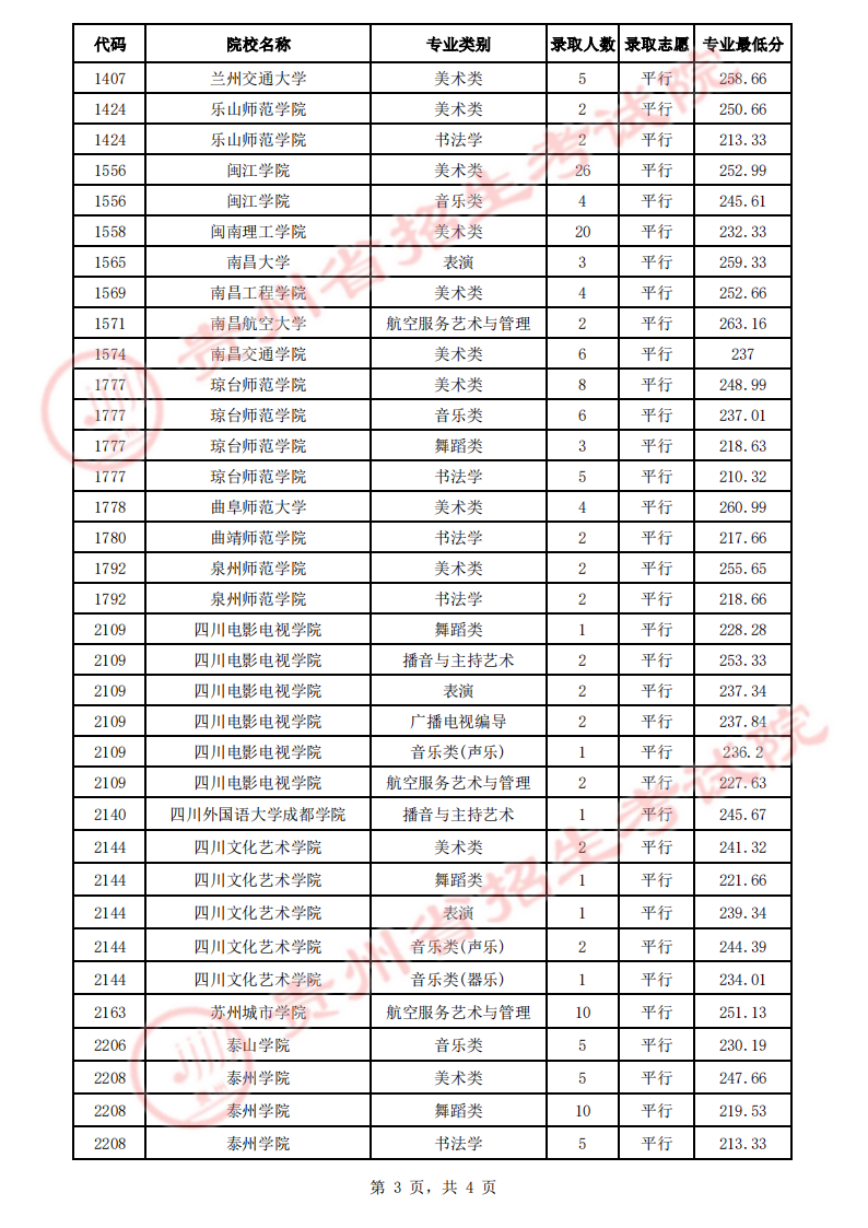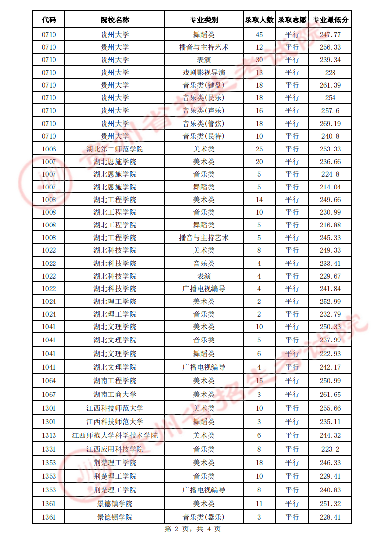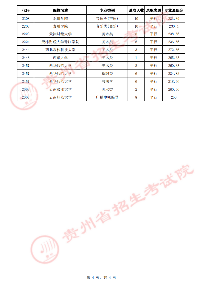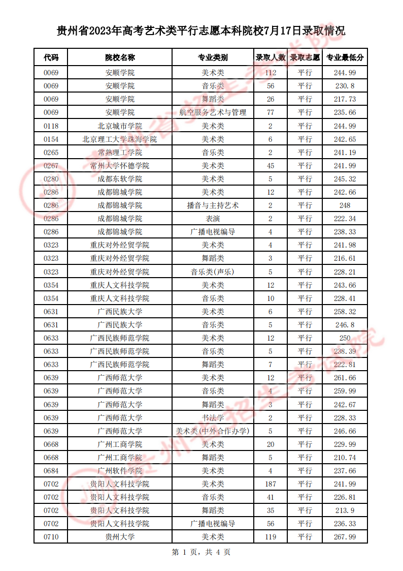 貴州省2023年高考藝術(shù)類(lèi)平行志愿本科院校7月17日錄取情況