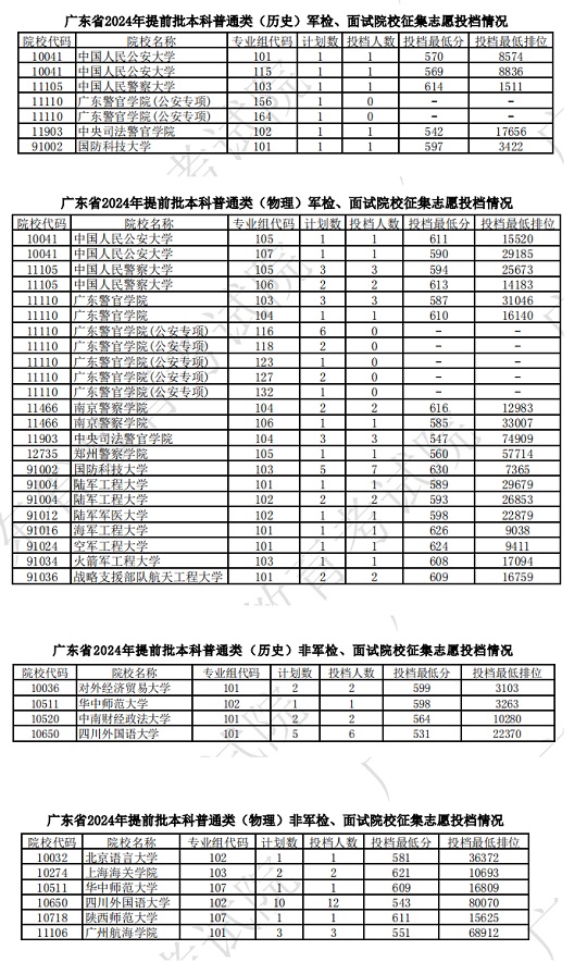 | 廣東省2024年提前批本科征集志愿投檔情況 |