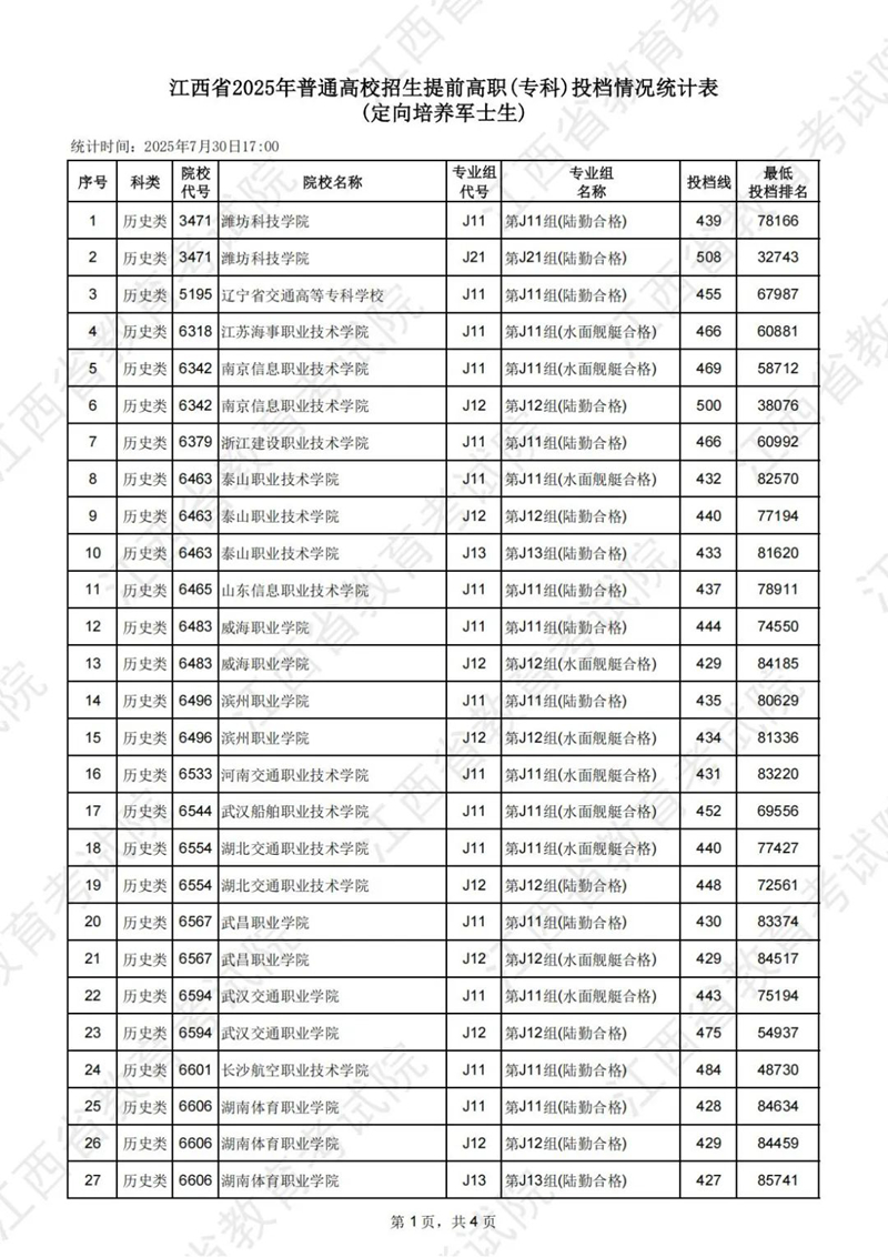 江西省2025年普通高校招生提前高職(?)投檔情況統(tǒng)計(jì)表(定向培養(yǎng)軍士生)