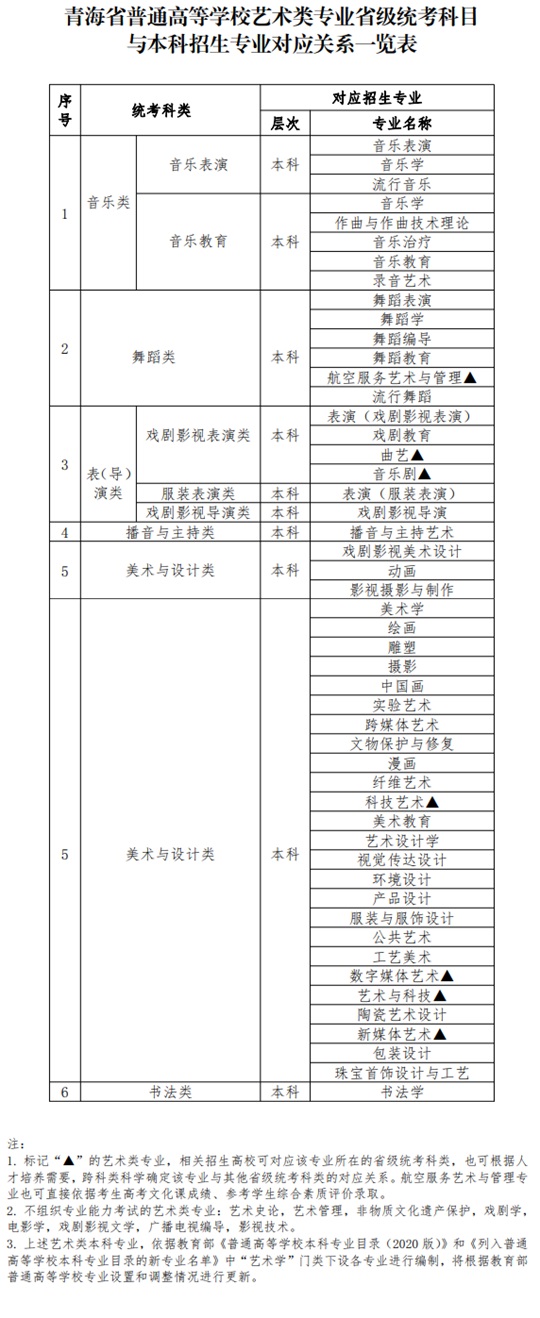 青海省普通高等學(xué)校藝術(shù)類專業(yè)省級(jí)統(tǒng)考科目與本科招生專業(yè)對(duì)應(yīng)關(guān)系一覽表
