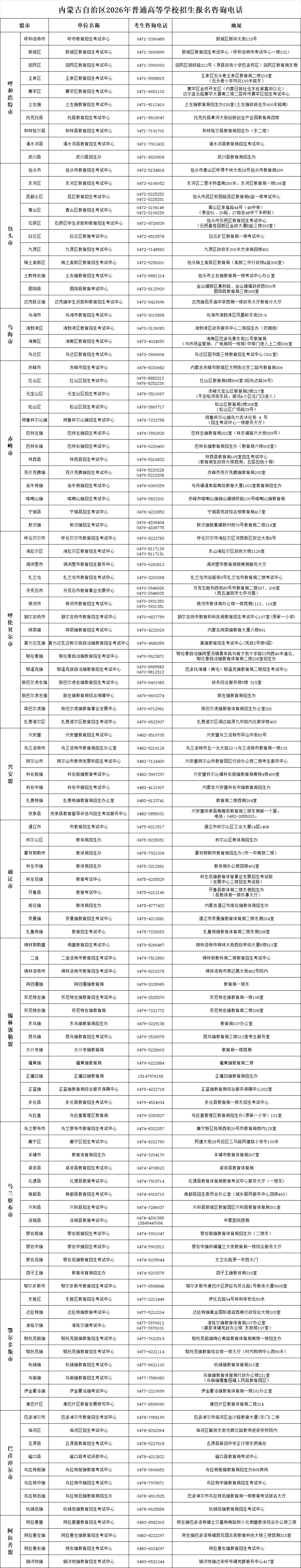 內蒙古自治區(qū)2026年普通高等學校招生報名咨詢電話