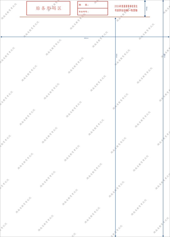 書法評(píng)卷采取計(jì)算機(jī)輔助評(píng)卷方式,要保持條形碼及條形碼粘貼區(qū)域(紅線以上區(qū)域,下同)清潔,嚴(yán)禁在條形碼上或條形碼粘貼區(qū)域涂抹。同時(shí),請(qǐng)考生按照《湖南省2026年普通高校招生書法類專業(yè)統(tǒng)一考試考生守則》(見附件1)做好相關(guān)準(zhǔn)備工作。