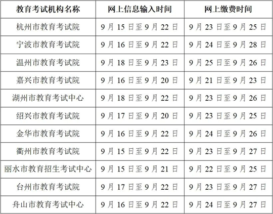職業(yè)技能考試分理論知識(shí)和技能操作兩部分,本次報(bào)名的是技能操作考試。職業(yè)技能操作考試的報(bào)名條件等信息詳見各設(shè)區(qū)市發(fā)布的職業(yè)技能操作考試報(bào)名公告?忌傻卿浾憬〗逃荚囋壕W(wǎng)站(www.zjzs.net)“考試招生”欄目或點(diǎn)擊文末“閱讀原文”查看有關(guān)公告,并按當(dāng)?shù)毓娲_定的要求報(bào)考。報(bào)名流程主要為網(wǎng)上信息輸入和網(wǎng)上繳費(fèi)兩階段,各地安排見下表。