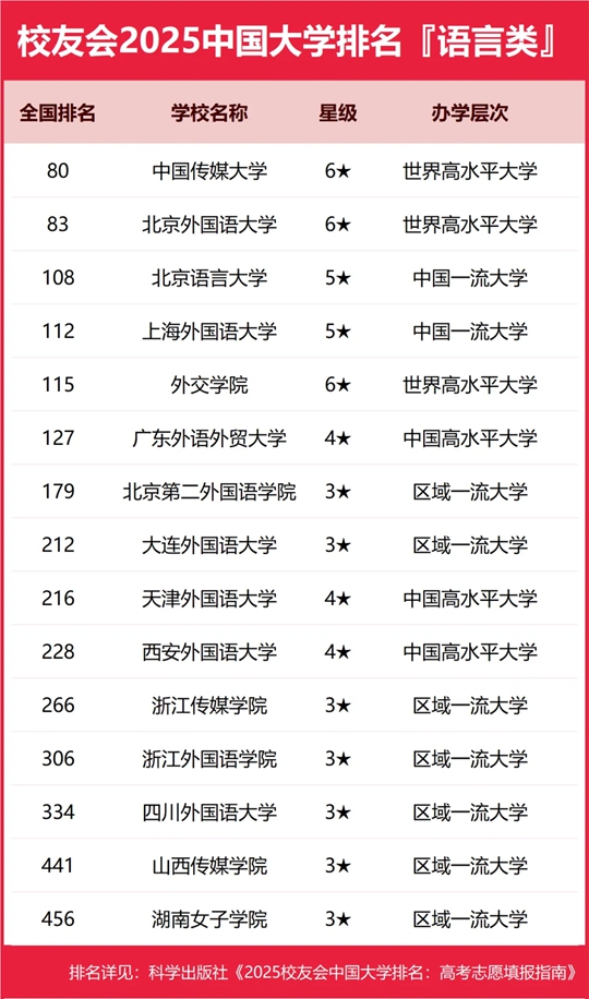 | 校友會2025中國語言類大學(xué)排名, 中國傳媒大學(xué)、黑龍江外國語學(xué)院、山東外國語職業(yè)技術(shù)大學(xué)第一 |