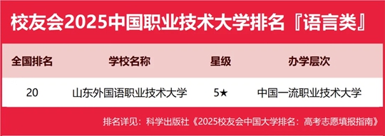 在校友會2025中國語言類職業(yè)技術(shù)大學(xué)排名中,山東外國語職業(yè)技術(shù)大學(xué)位居全國第20名,雄居校友會2025中國語言類職業(yè)技術(shù)大學(xué)排名首位。