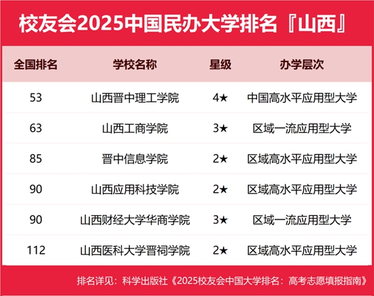 校友會2025山西省民辦大學(xué)排名,山西晉中理工學(xué)院第一,晉中信息學(xué)院第三