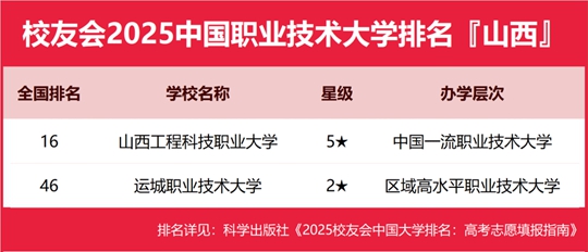 校友會2025山西省職業(yè)技術(shù)大學(xué)排名,山西工程科技職業(yè)大學(xué)第一,運(yùn)城職業(yè)技術(shù)大學(xué)第二