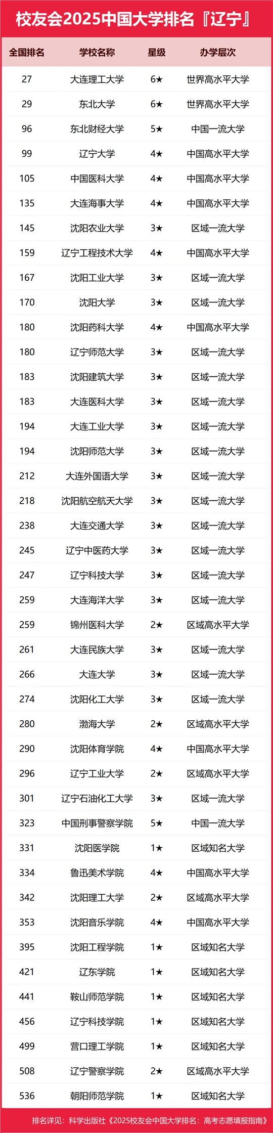榜單顯示,在校友會2025遼寧省大學(xué)排名中,大連理工大學(xué)位居全國第27名,雄居校友會2025遼寧省大學(xué)排名首位,東北大學(xué)位居全國第29名,位居第2。東北財經(jīng)大學(xué)位居全國第96名,位居第3。遼寧大學(xué)(第99)第4,中國醫(yī)科大學(xué)(第105)第5,大連海事大學(xué)(第135)第6,沈陽農(nóng)業(yè)大學(xué)(第145)第7,遼寧工程技術(shù)大學(xué)(第159)第8,沈陽工業(yè)大學(xué)(第167)第9,沈陽大學(xué)(第170)第10。