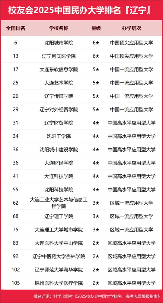 校友會2025遼寧省民辦大學(xué)排名,沈陽城市學(xué)院第一,遼寧何氏醫(yī)學(xué)院第二,大連財經(jīng)學(xué)院前十