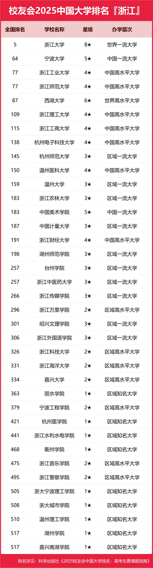 榜單顯示,在校友會(huì)2025浙江省大學(xué)排名中,浙江大學(xué)位居全國(guó)第5名,雄居校友會(huì)2025浙江省大學(xué)排名首位,寧波大學(xué)位居全國(guó)第64名,位居第2。浙江工業(yè)大學(xué)位居全國(guó)第77名,位居第3。浙江師范大學(xué)位居全國(guó)第77名,位居第3。西湖大學(xué)(第87)第5,浙江理工大學(xué)(第109)第6,浙江工商大學(xué)(第115)第7,杭州電子科技大學(xué)(第138)第8,杭州師范大學(xué)(第145)第9,溫州醫(yī)科大學(xué)(第150)第10。