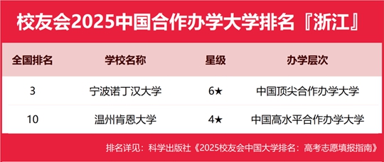 校友會(huì)2025浙江省合作辦學(xué)大學(xué)排名,寧波諾丁漢大學(xué)第一,溫州肯恩大學(xué)第二