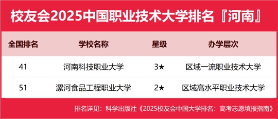 校友會2025河南省職業(yè)技術(shù)大學(xué)排名,河南科技職業(yè)大學(xué)第一,漯河食品工程職業(yè)大學(xué)第二