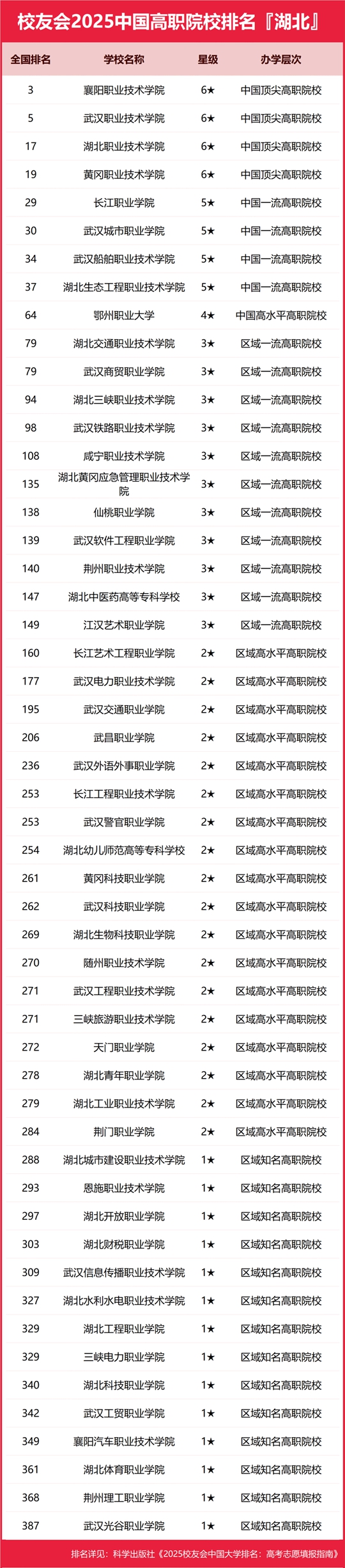 校友會(huì)2025湖北省高職院校排名,襄陽職業(yè)技術(shù)學(xué)院第一,長江職業(yè)學(xué)院前五在校友會(huì)2025湖北省高職院校排名中,襄陽職業(yè)技術(shù)學(xué)院位居全國第3名,雄居校友會(huì)2025湖北省高職院校排名首位,武漢職業(yè)技術(shù)學(xué)院位居全國第5名,位居第2。湖北職業(yè)技術(shù)學(xué)院位居全國第17名,位居第3。黃岡職業(yè)技術(shù)學(xué)院(第19)第4,長江職業(yè)學(xué)院(第29)第5,武漢城市職業(yè)學(xué)院(第30)第6,武漢船舶職業(yè)技術(shù)學(xué)院(第34)第7,湖北生態(tài)工程職業(yè)技術(shù)學(xué)院(第37)第8,鄂州職業(yè)大學(xué)(第64)第9,武漢商貿(mào)職業(yè)學(xué)院(第79)第10。湖北交通職業(yè)技術(shù)學(xué)院(第79)第10。