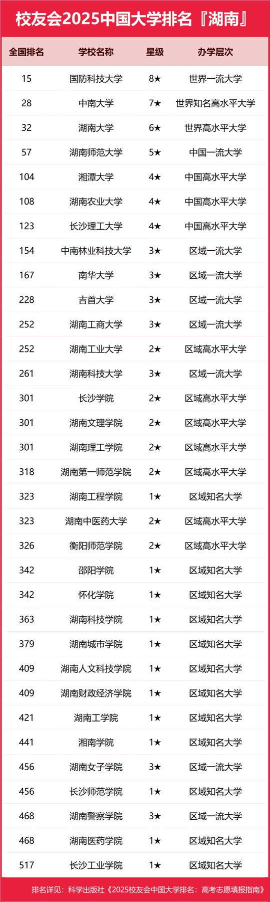 校友會2025湖南省大學(xué)排名,國防科技大學(xué)第一,中南大學(xué)第二