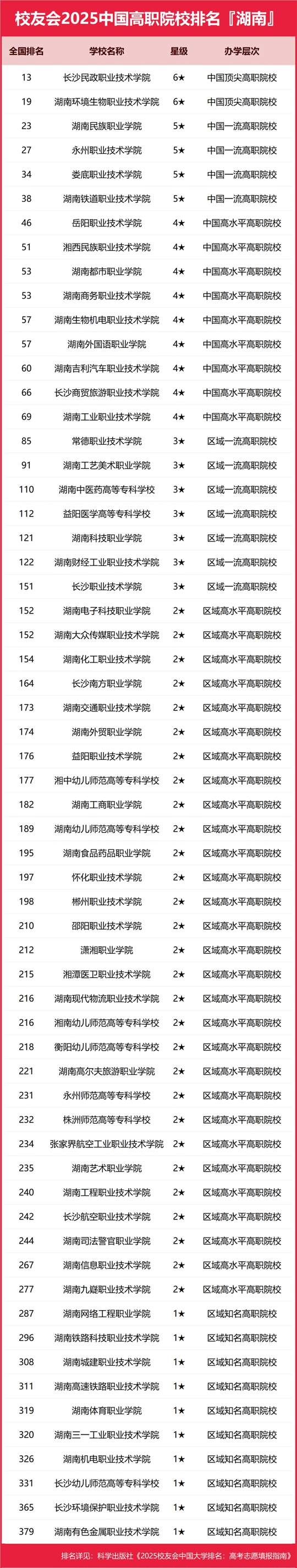 在校友會2025湖南省高職院校排名中,長沙民政職業(yè)技術(shù)學(xué)院位居全國第13名,雄居校友會2025湖南省高職院校排名首位,湖南環(huán)境生物職業(yè)技術(shù)學(xué)院位居全國第19名,位居第2。湖南民族職業(yè)學(xué)院位居全國第23名,位居第3。永州職業(yè)技術(shù)學(xué)院(第27)第4,婁底職業(yè)技術(shù)學(xué)院(第34)第5,湖南鐵道職業(yè)技術(shù)學(xué)院(第38)第6,岳陽職業(yè)技術(shù)學(xué)院(第46)第7,湘西民族職業(yè)技術(shù)學(xué)院(第51)第8,湖南商務(wù)職業(yè)技術(shù)學(xué)院(第53)第9,湖南都市職業(yè)學(xué)院(第53)第9。