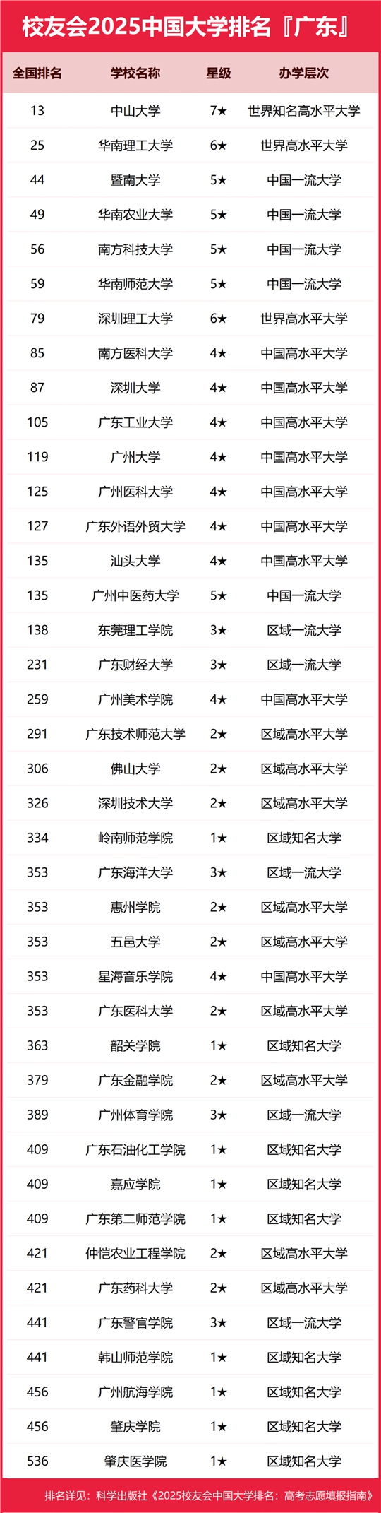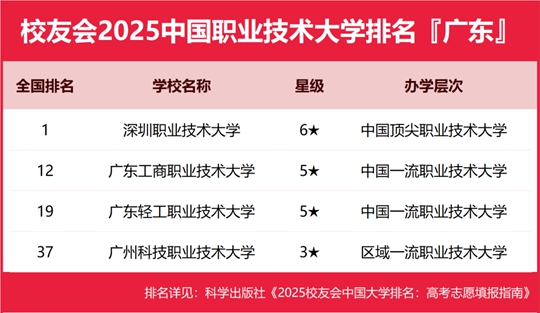 中山大學位居2025廣東省大學排名第一,廣州南方學院位居2025廣東省民辦大學排名第一,廣東科貿(mào)職業(yè)學院位居2025廣東省高職院校排名第一,北京師范大學——香港浸會大學聯(lián)合國際學院位居2025廣東省合作辦學大學排名第一,深圳職業(yè)技術大學位居2025廣東省職業(yè)技術大學排名第一。