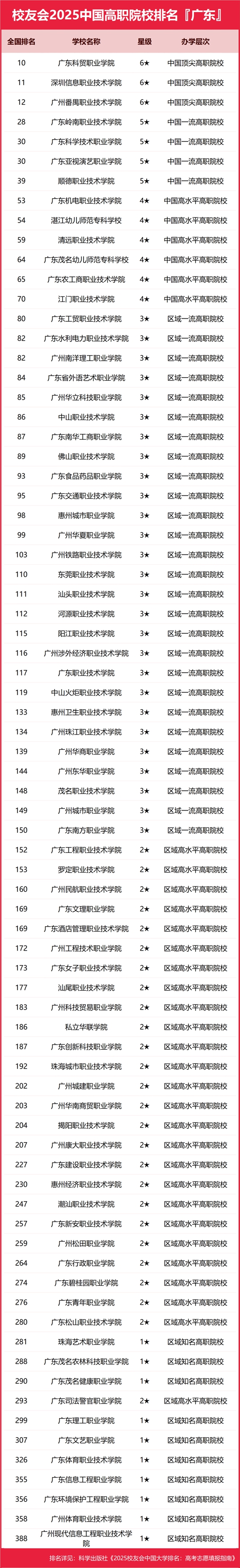 在校友會2025廣東省高職院校排名中,廣東科貿(mào)職業(yè)學院位居全國第10名,雄居校友會2025廣東省高職院校排名首位,深圳信息職業(yè)技術學院位居全國第11名,位居第2。廣州番禺職業(yè)技術學院位居全國第12名,位居第3。廣東嶺南職業(yè)技術學院(第28)第4,廣東亞視演藝職業(yè)學院(第30)第5,廣東科學技術職業(yè)學院(第30)第5,順德職業(yè)技術學院(第39)第7,廣東機電職業(yè)技術學院(第53)第8,湛江幼兒師范專科學校(第54)第9,清遠職業(yè)技術學院(第59)第10。