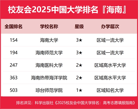 | 校友會2025海南省大學(xué)排名,海南大學(xué)、三亞學(xué)院、海南科技職業(yè)大學(xué)第一 |