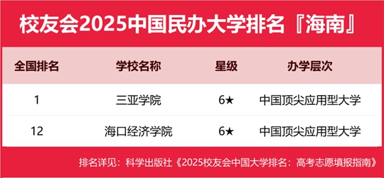 校友會2025海南省民辦大學(xué)排名,三亞學(xué)院第一,?诮(jīng)濟(jì)學(xué)院第二