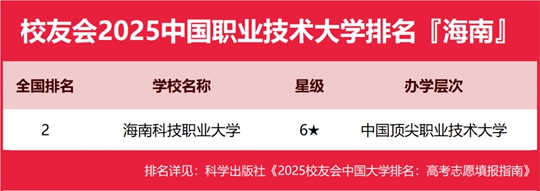 在校友會2025海南省職業(yè)技術(shù)大學(xué)排名中,海南科技職業(yè)大學(xué)位居全國第2名,雄居校友會2025海南省職業(yè)技術(shù)大學(xué)排名首位。