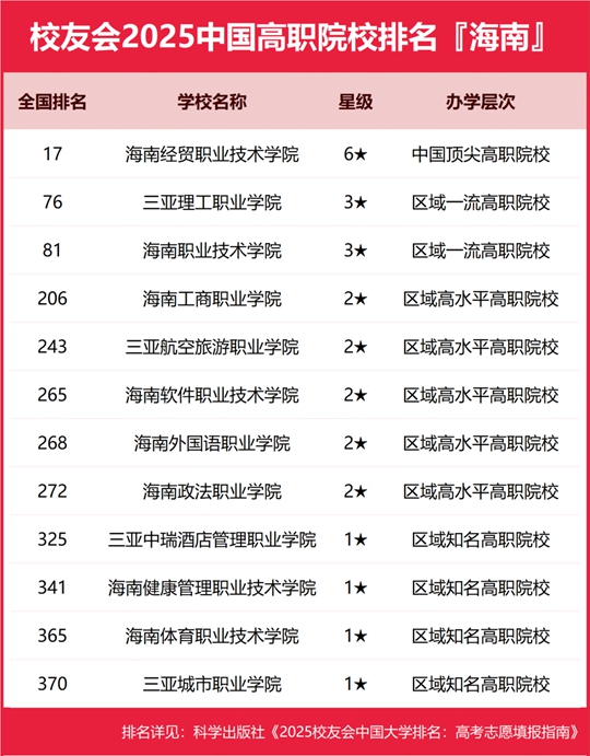 校友會2025海南省高職院校排名,海南經(jīng)貿(mào)職業(yè)技術(shù)學(xué)院第一,三亞理工職業(yè)學(xué)院第二