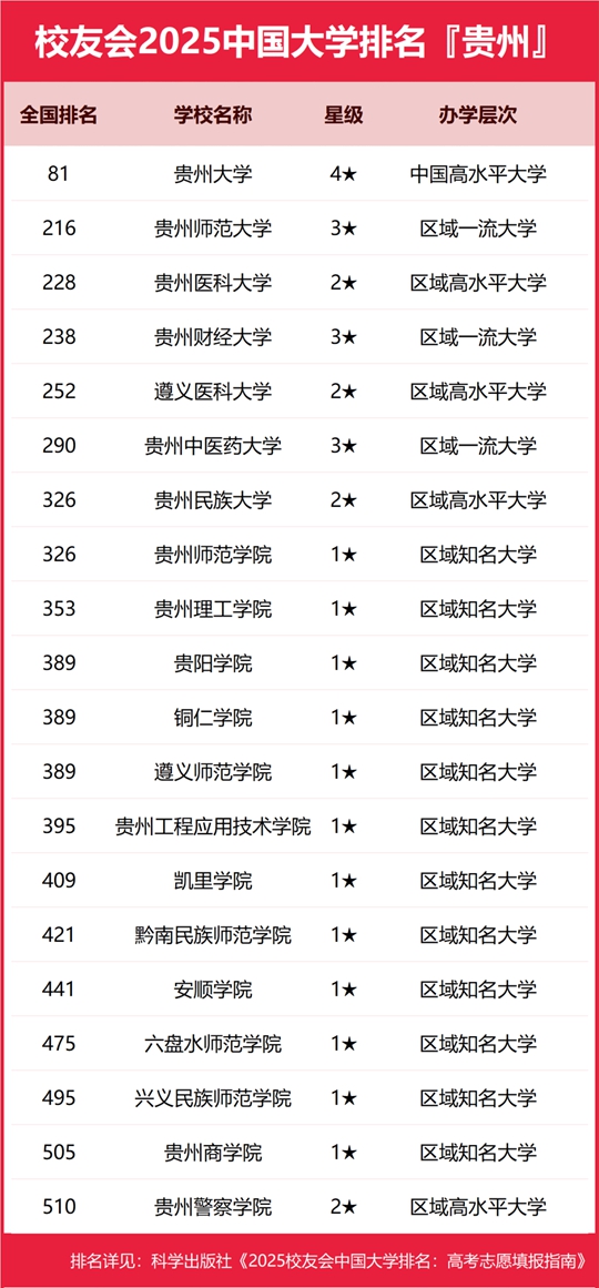 榜單顯示,在校友會(huì)2025貴州省大學(xué)排名中,貴州大學(xué)位居全國(guó)第81名,雄居校友會(huì)2025貴州省大學(xué)排名首位,貴州師范大學(xué)位居全國(guó)第216名,位居第2。貴州醫(yī)科大學(xué)位居全國(guó)第228名,位居第3。貴州財(cái)經(jīng)大學(xué)(第238)第4,遵義醫(yī)科大學(xué)(第252)第5,貴州中醫(yī)藥大學(xué)(第290)第6,貴州民族大學(xué)(第326)第7,貴州師范學(xué)院(第326)第7,貴州理工學(xué)院(第353)第9,遵義師范學(xué)院(第389)第10,貴陽學(xué)院(第389)第10,銅仁學(xué)院(第389)第10。