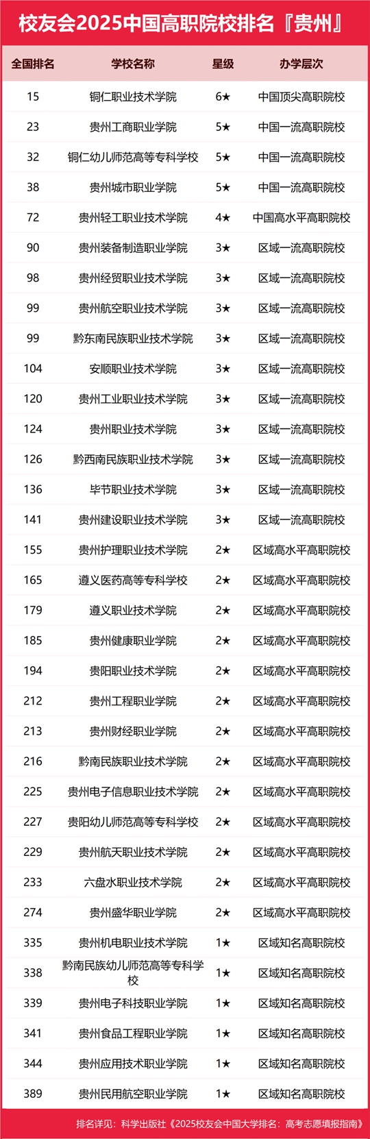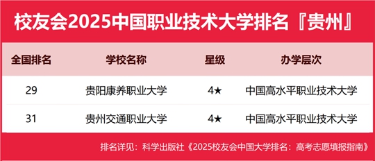 校友會(huì)2025貴州省職業(yè)技術(shù)大學(xué)排名,貴陽康養(yǎng)職業(yè)大學(xué)第一,貴州交通職業(yè)大學(xué)第二