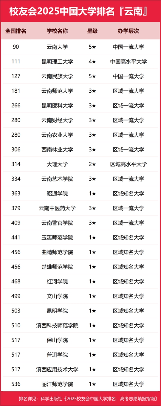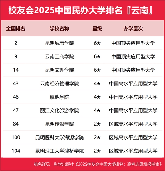 | 校友會2025云南省大學排名,云南大學、昆明城市學院、昆明冶金高等?茖W校第一 |
