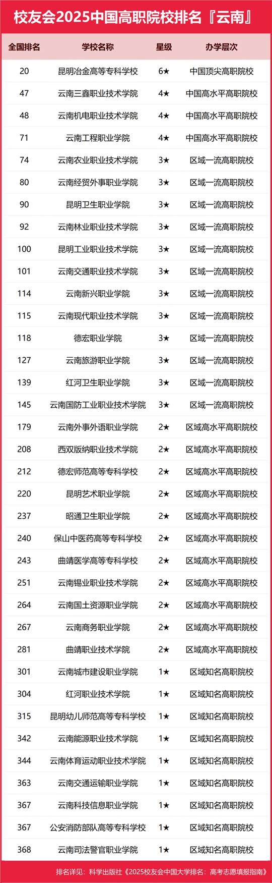 校友會2025云南省高職院校排名,昆明冶金高等?茖W校第一,云南三鑫職業(yè)技術學院第二
