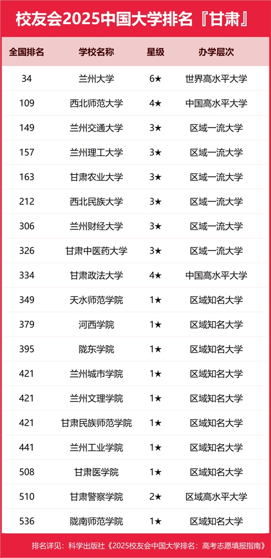 蘭州大學(xué)位居2025甘肅省大學(xué)排名第一,蘭州工商學(xué)院位居2025甘肅省民辦大學(xué)排名第一,酒泉職業(yè)技術(shù)學(xué)院位居2025甘肅省高職院校排名第一,蘭州資源環(huán)境職業(yè)技術(shù)大學(xué)位居2025甘肅省職業(yè)技術(shù)大學(xué)排名第一。