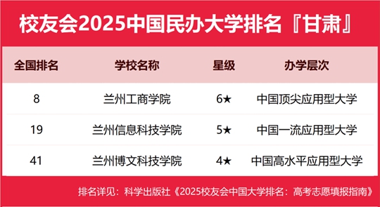 | 校友會2025甘肅省大學(xué)排名,蘭州大學(xué)、蘭州工商學(xué)院、蘭州資源環(huán)境職業(yè)技術(shù)大學(xué)第一 |