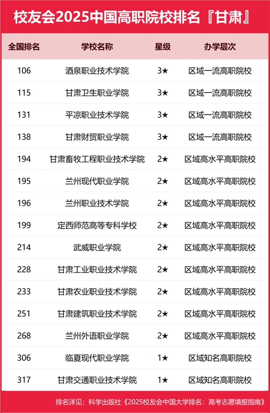 2025甘肅省高職院校排名,酒泉職業(yè)技術(shù)學(xué)院第一,甘肅衛(wèi)生職業(yè)學(xué)院第二