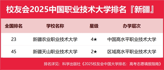 校友會(huì)2025新疆維吾爾自治區(qū)職業(yè)技術(shù)大學(xué)排名,新疆農(nóng)業(yè)職業(yè)技術(shù)大學(xué)第一,新疆天山職業(yè)技術(shù)大學(xué)第二