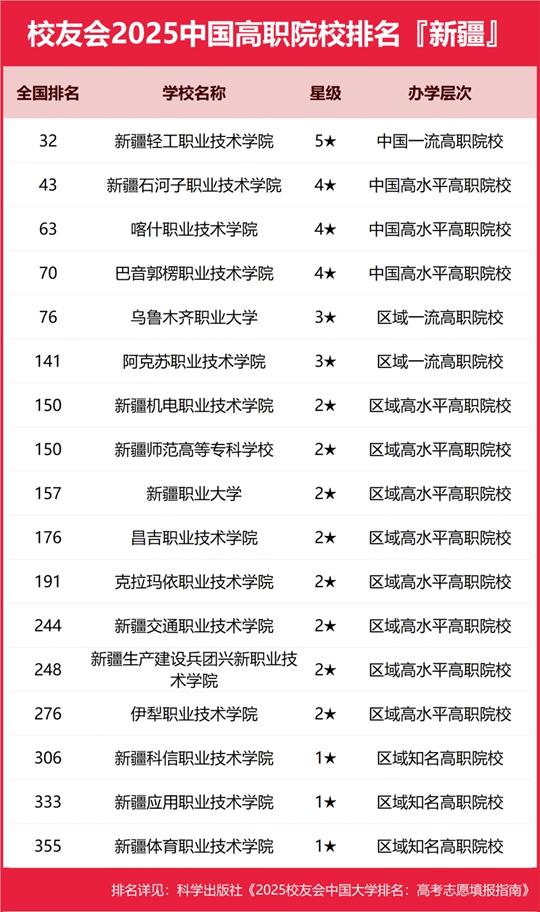 校友會(huì)2025新疆維吾爾自治區(qū)高職院校排名,新疆輕工職業(yè)技術(shù)學(xué)院第一,巴音郭楞職業(yè)技術(shù)學(xué)院第四