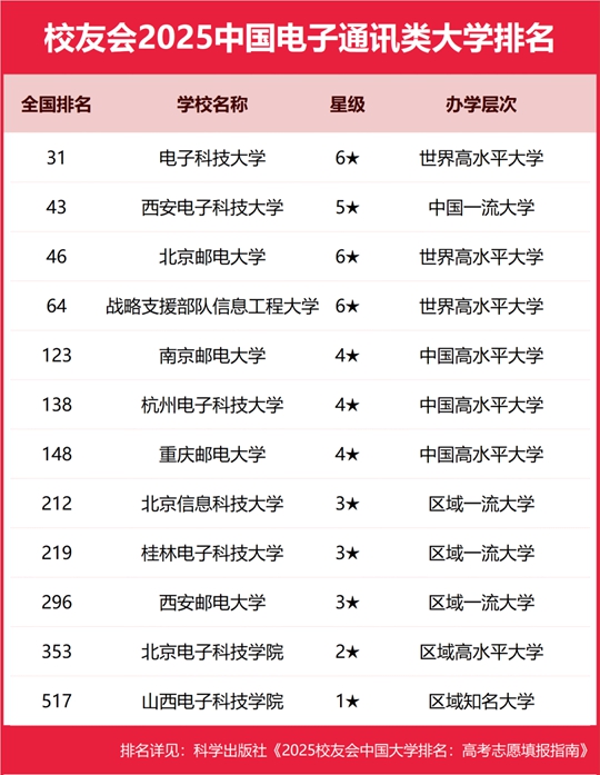 電子科技大學(xué)位居2025中國(guó)電子通訊類大學(xué)排名榜首,南京郵電大學(xué)第五