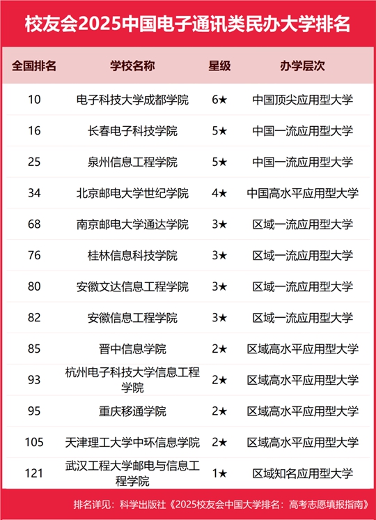 電子科技大學(xué)成都學(xué)院位列2025中國(guó)電子通訊類民辦大學(xué)排名榜首,泉州信息工程學(xué)院前三