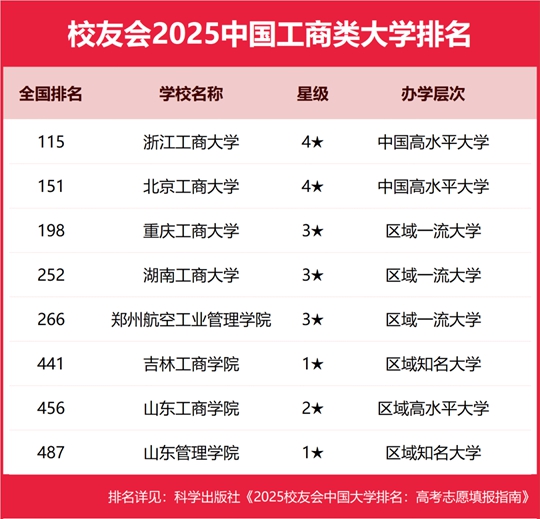榜單顯示,在校友會(huì)2025中國(guó)大學(xué)排名中,浙江工商大學(xué)全國(guó)排名第115名,雄居校友會(huì)2025中國(guó)工商類(lèi)大學(xué)排名第一。北京工商大學(xué)第二,重慶工商大學(xué)第三,湖南工商大學(xué)第四,鄭州航空工業(yè)管理學(xué)院第五。