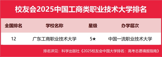 廣東工商職業(yè)技術(shù)大學(xué)雄居2025中國(guó)工商類(lèi)職業(yè)技術(shù)大學(xué)排名第一
