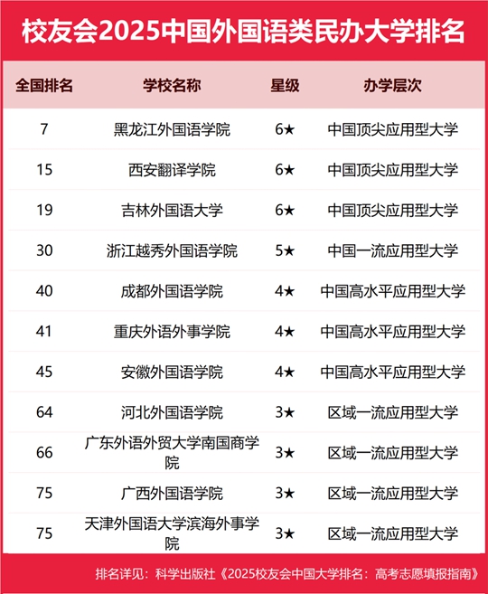 黑龍江外國(guó)語(yǔ)學(xué)院位列2025中國(guó)外國(guó)語(yǔ)民辦大學(xué)排名榜首,成都外國(guó)語(yǔ)學(xué)院第五