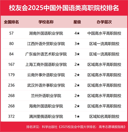 湖南外國(guó)語(yǔ)職業(yè)學(xué)院勇奪2025中國(guó)外國(guó)語(yǔ)高職院校排名第一,廣東省外語(yǔ)藝術(shù)職業(yè)學(xué)院第三