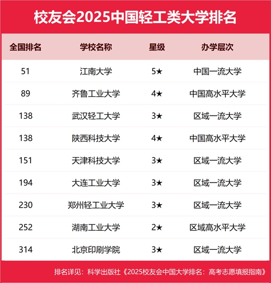 榜單顯示,在校友會(huì)2025中國(guó)大學(xué)排名中,江南大學(xué)全國(guó)排名第51名,雄居校友會(huì)2025中國(guó)輕工類大學(xué)排名第一。齊魯工業(yè)大學(xué)第二,武漢輕工大學(xué)第三,陜西科技大學(xué)第四,天津科技大學(xué)第五。